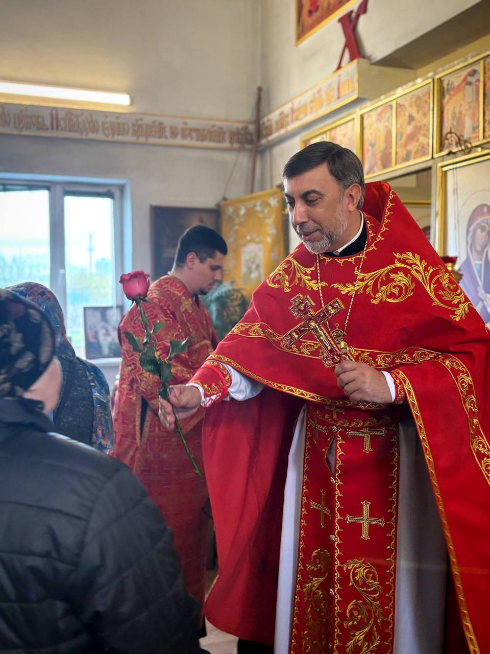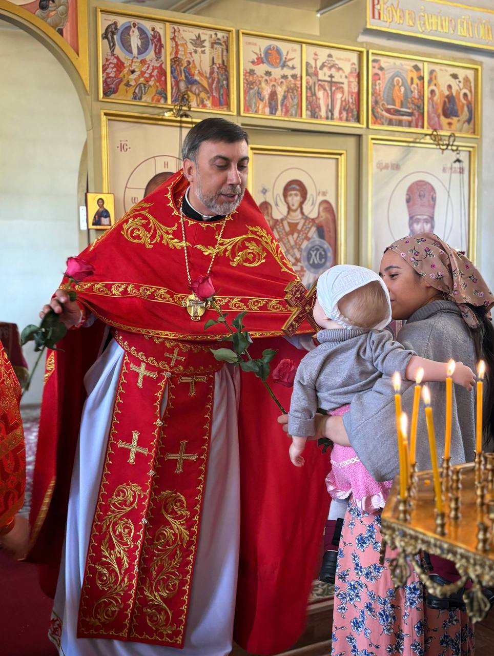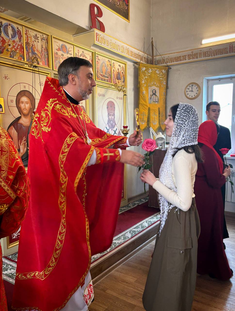26.04.2026г. Святых жен-мироносиц. По завершении праздничного богослужения настоятель храма поздравил всех прихожанок с этим особым праздником и подарил цветы.